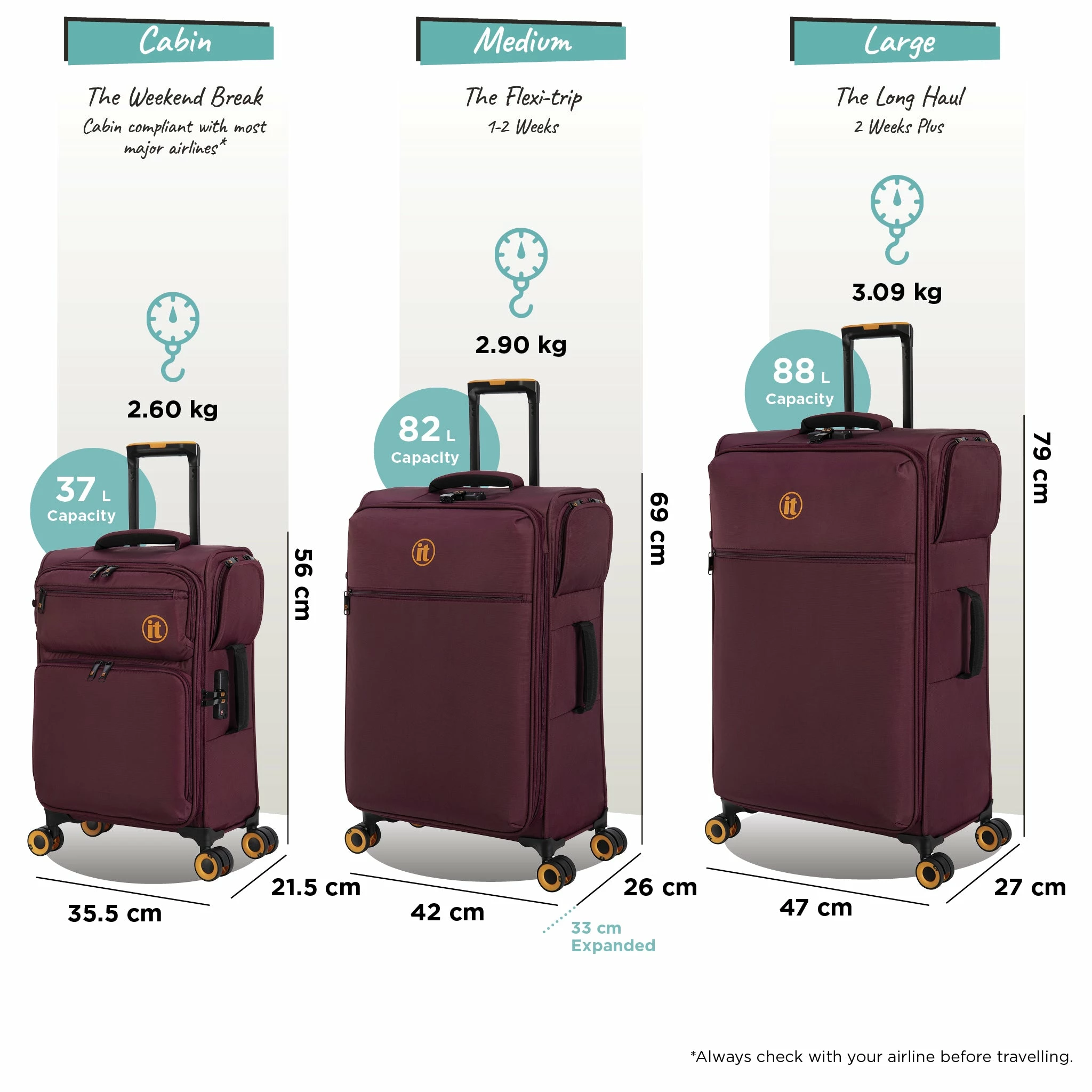 All 3 matching cases come compete with an in-built TSA-approved combination lock, plus the Medium Plus features a zippered expander section to increase packing capacity by up to 25%.